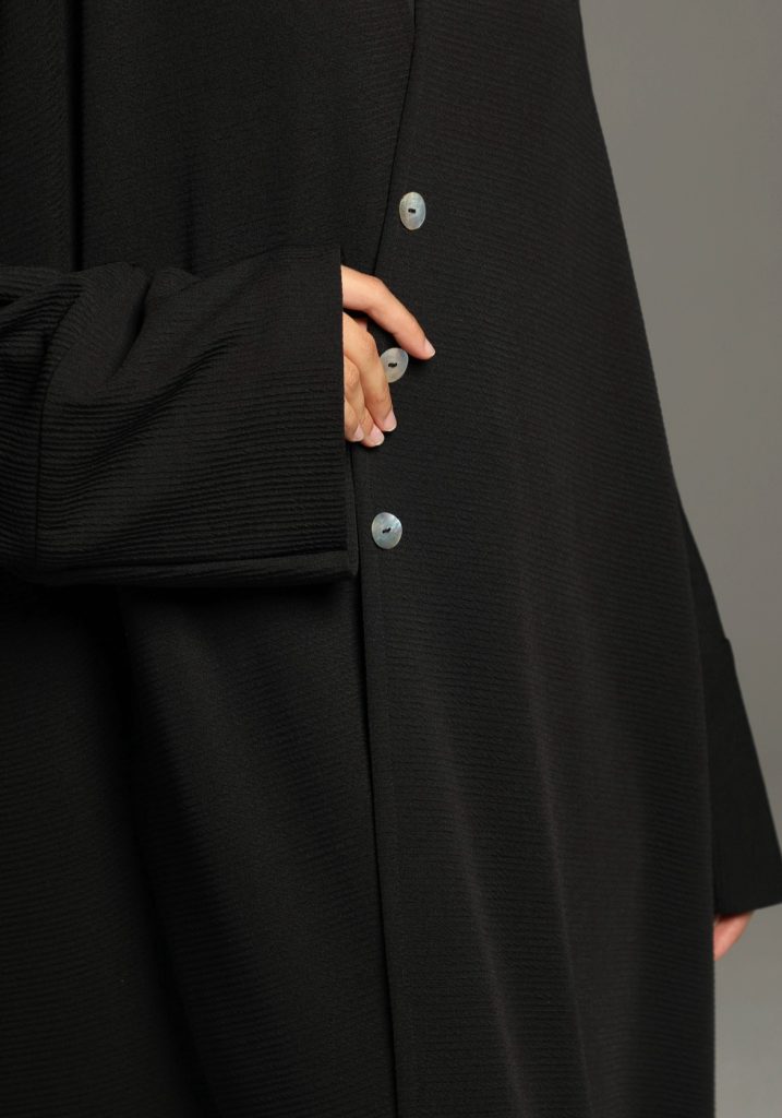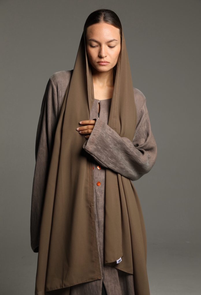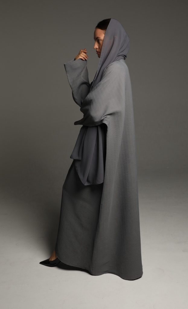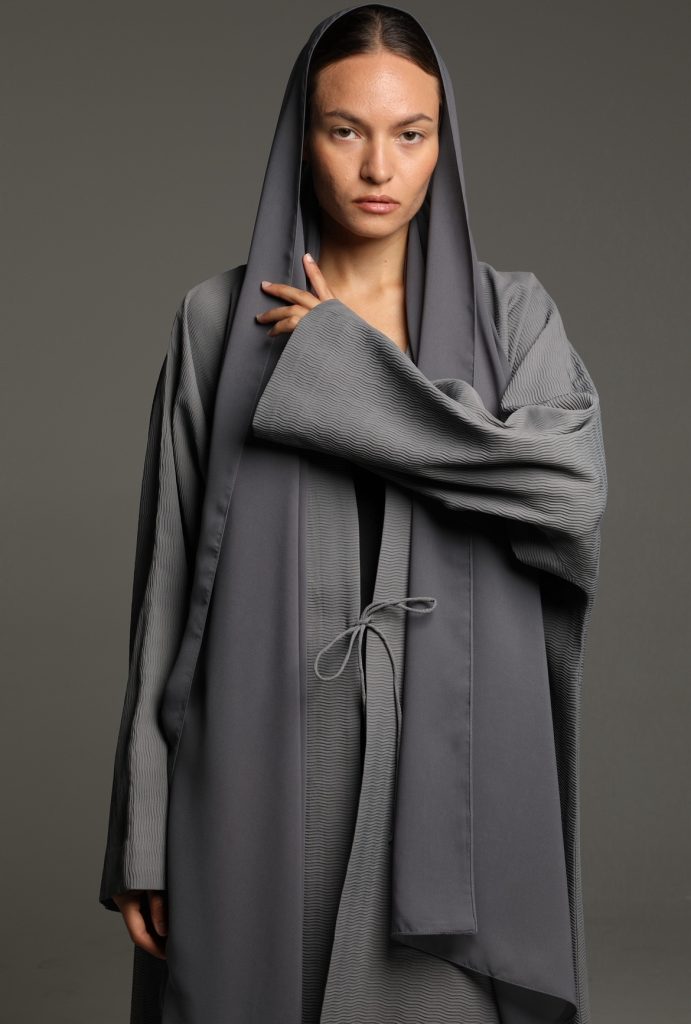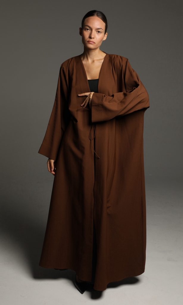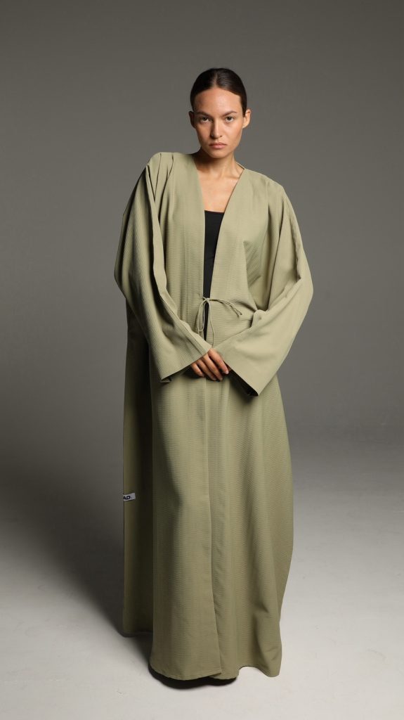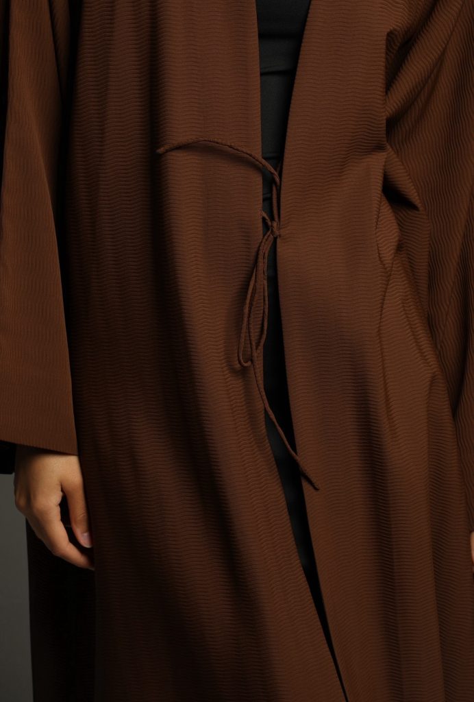This abaya features a soft, textured fabric with a relaxed silhouette, enhanced by a minimalist tie-waist detail for a refined yet effortless look. Its versatile design makes it perfect for both casual and formal occasions, embodying timeless sophistication.