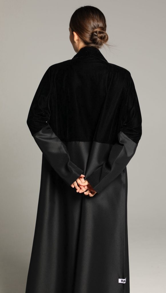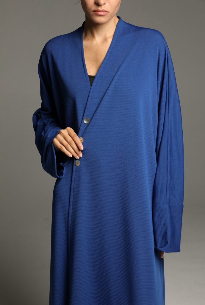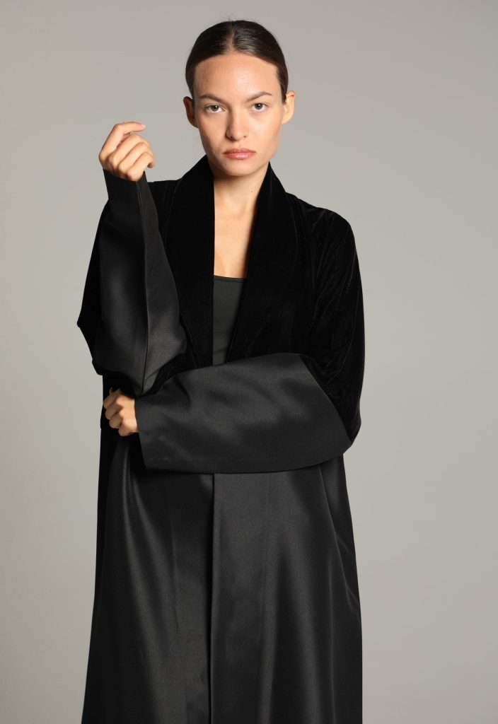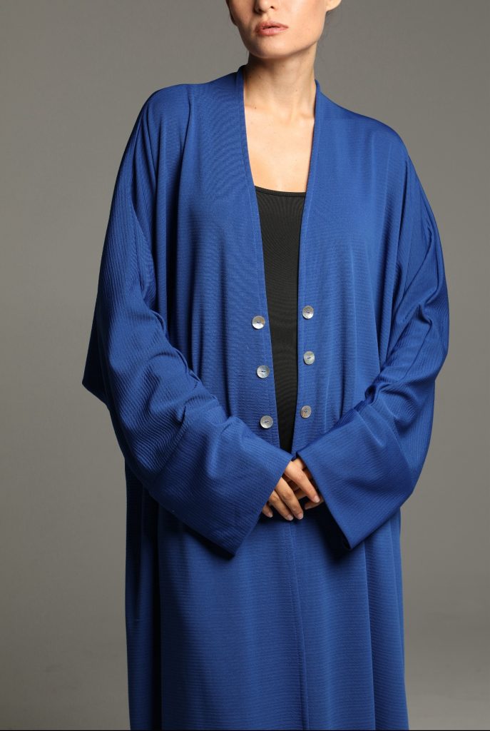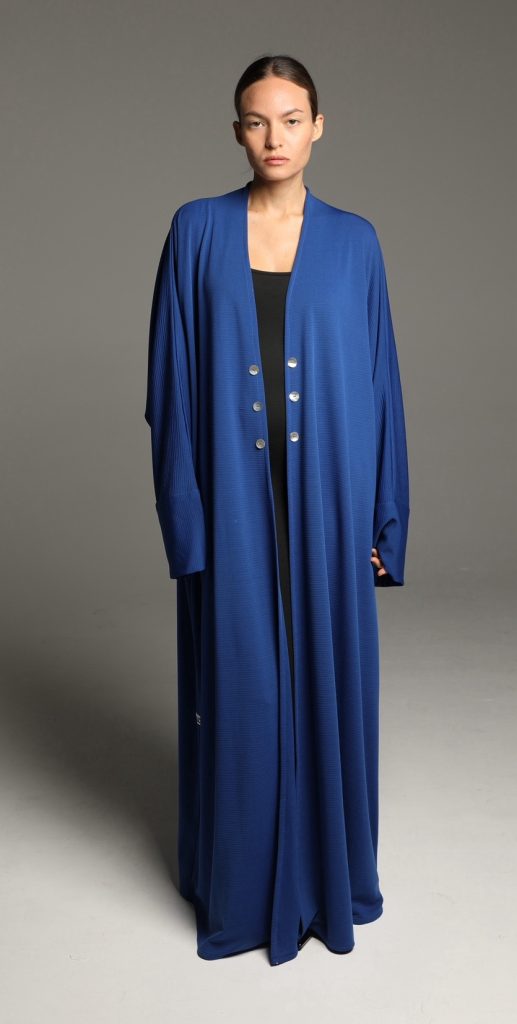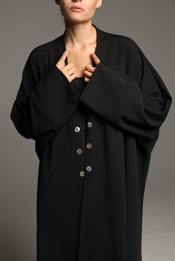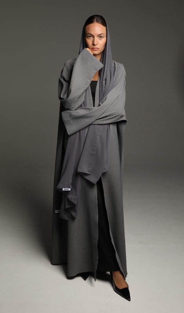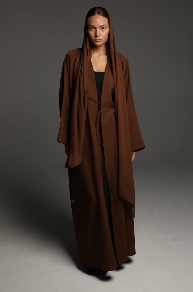 This abaya features a soft, textured fabric with a relaxed silhouette, enhanced by a minimalist tie-waist detail for a refined yet effortless look. Its versatile design makes it perfect for both casual and formal occasions, embodying timeless sophistication.
