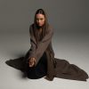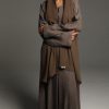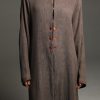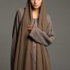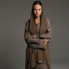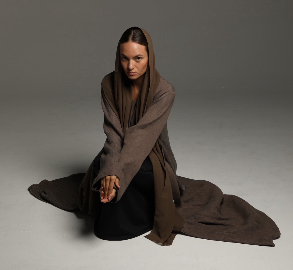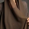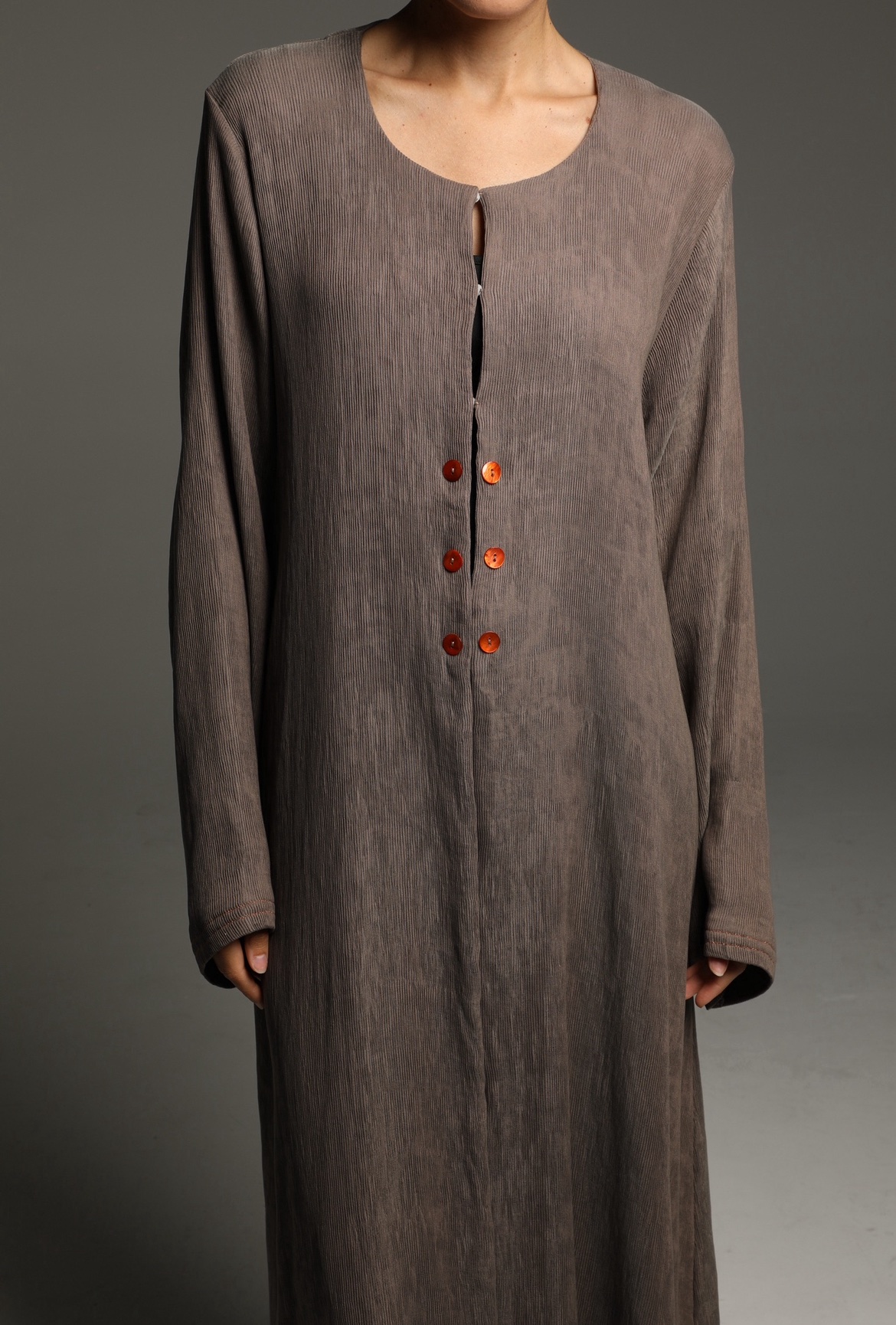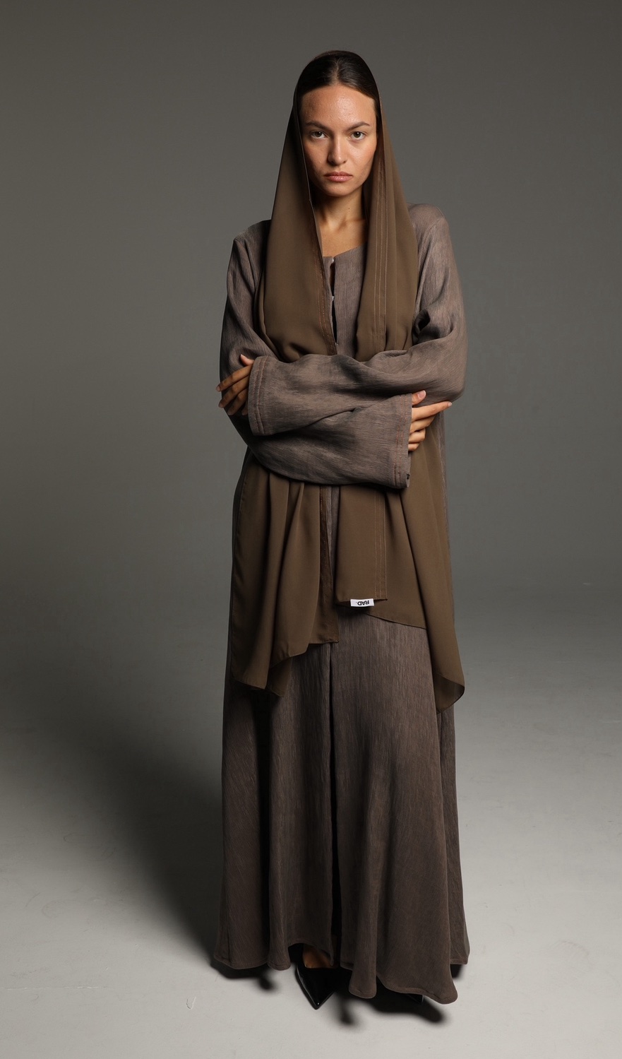 A minimalist taupe abaya featuring a textured fabric and accented with bold amber-toned buttons. Paired with a matching sheila stitched with fine details, this design combines understated elegance with contemporary flair, perfect for versatile styling.